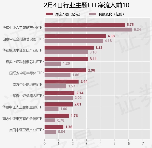 当日有116只行业主题ETF基金出现资金净流入,其中净流入排首位的是华富中证人工智能产业ETF(515980),份额增加了6.24亿份,净流入额为5.75亿元。