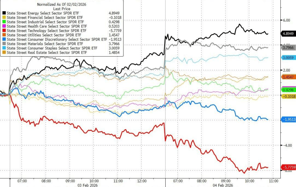 软件股抛售潮继续蔓延至半导体、AI概念股等整个科技领域,尽管宏观数据好坏参半,但并未给市场提供支撑。资金从科技和成长股中撤出,轮动至能源、材料等价值板块。