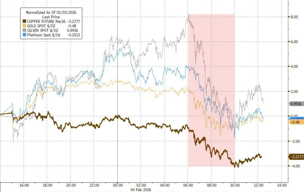 贵金属方面,波动明显加剧。黄金盘中一度重返5000美元上方,但随着美元走强和风险资产再度承压,未能站稳,回落至5000下方。白银相对抗跌,小幅收涨,而铂金、钯金在早盘反弹后回吐涨幅。整体来看,贵金属更多受美元与资金再平衡影响,尚未形成新的趋势性方向。