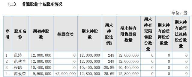 辅导备案显示,范爱荣直接持有公司1280万股,持股比例25.60%;范秋兰直接持有公司1200万股,持股比例24%;范涛直接持有公司1200万股,持股比例24%,范爱荣与范秋兰系父女关系,与范涛系父子关系,上述3人为公司控股股东,合计控股73.6%。