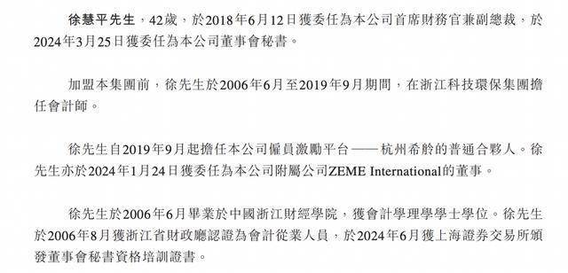 徐慧平,42岁,于2018年6月12日获委任为公司首席财务官兼副总裁,于2024年3月25日获委任为公司董事会秘书。