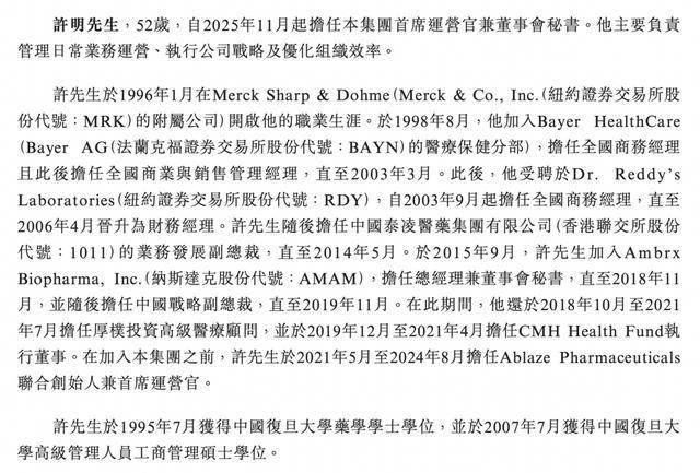 许明,52岁,自2025年11月起担任集团首席运营官兼董事会秘书。他主要负责管理日常业务运营、执行公司战略及优化组织效率。