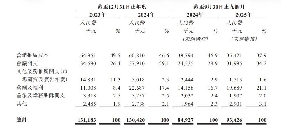 《财中社》注意到,公司销售及分销开支中的“薪酬及福利”从2023年的1101万元增至2024年的2269万元,同比增幅超100%。尽管2024年薪酬支出翻倍,但在总销售费用中,支付给营销服务商的营销推广成本(6081万元)和会议开支(3791万元)依然占据绝大比例,合计约75.7%。