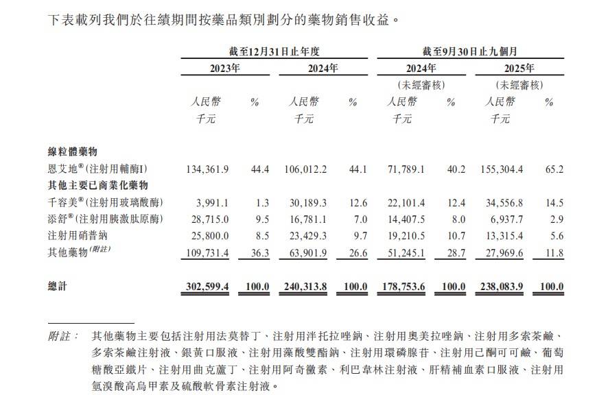 值得注意的是,四款产品中恩艾地®贡献核心收入,是康诺生物的核心单品。2023年、2024年及2025年前九个月,恩艾地®销售收入分别为1.3亿元、1.1亿元及1.6亿元,分别占同期总收益的44.4%、44.1%及65.2%。公司在申报材料中强调其在线粒体功能障碍治疗领域的地位,并将其与当下热门的NAD+(烟酰胺腺嘌呤二核苷酸)抗衰老概念紧密绑定。