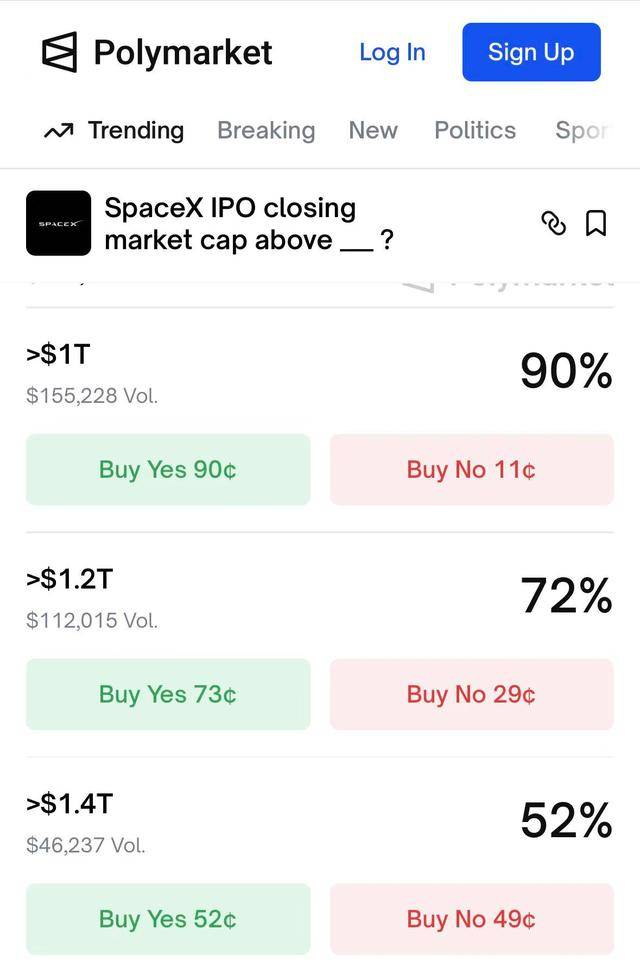 不过,有网友发现,在预测平台Polymarket上,SpaceX的IPO估值被低估。截至2月5日,Polymarket数据显示,SpaceX IPO收盘市值超过1万亿的概率达90%,超过1.2万亿的概率超72%。网友指出,日前SpaceX和xAI最近的合并为IPO释放了积极信号,保守估值认为:SpaceX(1万亿美元)+ xAI(2500亿美元)= 1.25万亿美元。