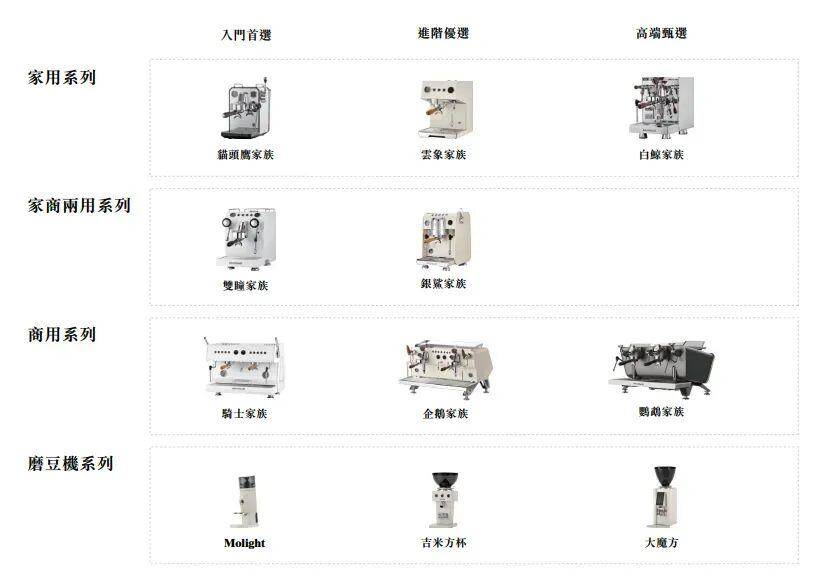 格米莱的产品组合覆盖家用意式咖啡机、家商两用意式咖啡机、商用意式咖啡机和磨豆机四大品类。