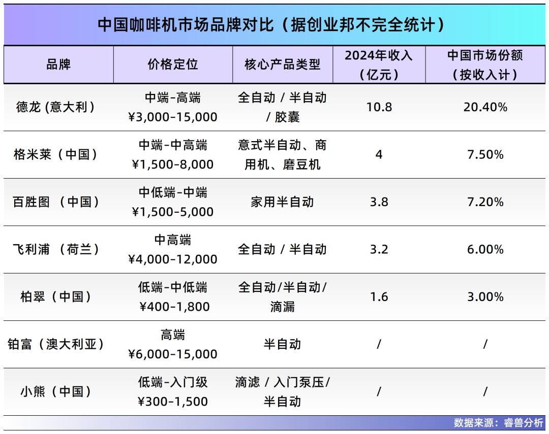 按2024年收入计,格米莱成为中国咖啡机市场的第二大品牌,仅次于欧洲品牌德龙;同时是排名第一的中国本土品牌,国内市场份额为7.5%。在技术含量更高的分体式半自动意式咖啡机市场,格米莱的领先优势更为明显,市场份额高达27.9%,显示出其在专业咖啡爱好者群体中的影响力。