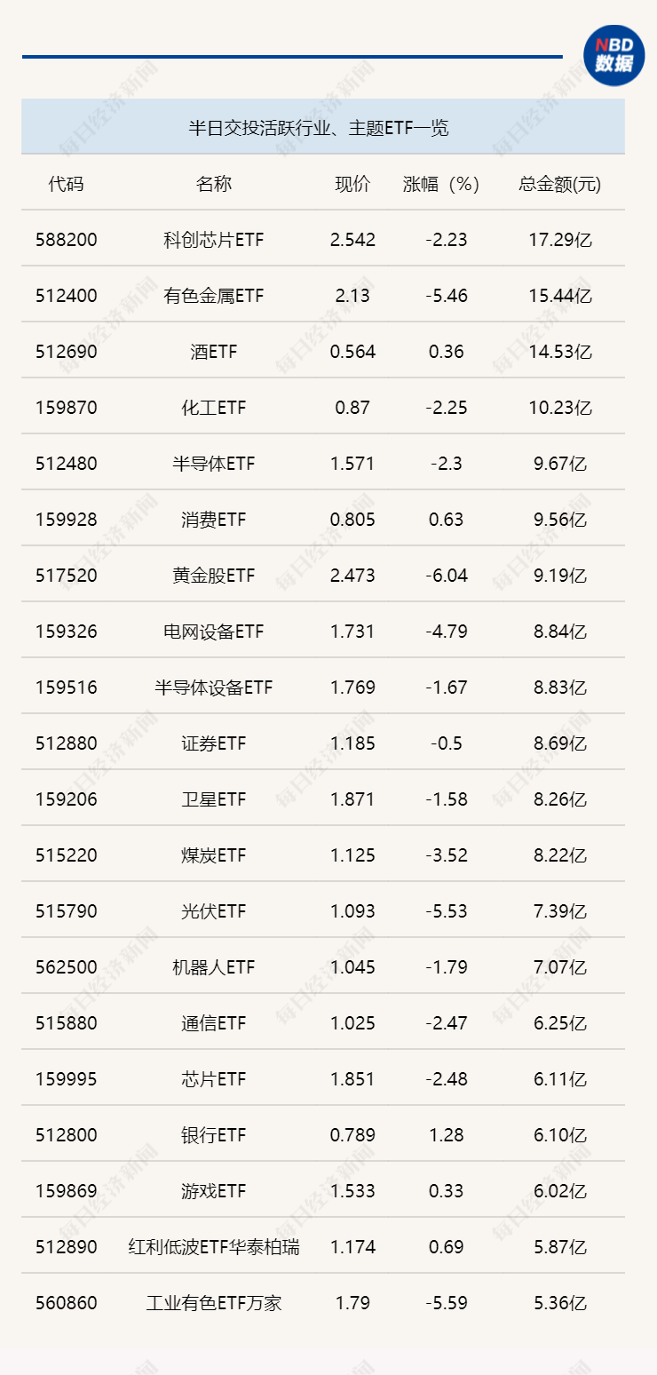 2月5日上午,行业、主题ETF交易量依旧平淡,科创芯片(588200)和有色金属(512400)半日成交金额超过15亿元;跨境ETF方面,恒生科技指数ETF(513180)半日成交金额近45亿元,成交量相对较大。