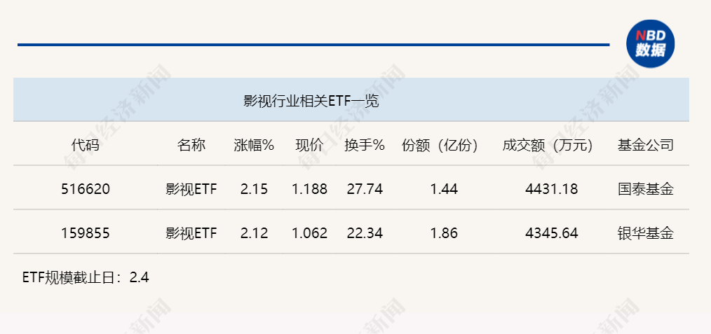 点评:影视ETF(516620)和影视ETF(159855)今日上午分别上涨2.15%和2.12%,其中,影视ETF(159855)规模较大,其份额为1.86亿份,半日成交金额为4345.64万元,上述两只ETF均追踪的是中证影视主题指数。