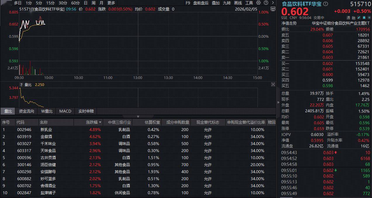吃喝板块今日(2月5日)继续上攻!反映吃喝板块整体走势的食品饮料ETF华宝(515710)开盘后震荡走高,盘中场内价格最高涨1%,截至发稿,逆市涨0.5%。