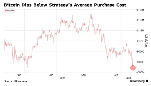该公司当前的比特币持仓成本为76037美元,这一数字长期被视作市场心理支撑位。上周六,比特币价格跌破76000美元,本周一亚洲交易时段再度下探,这一支撑位宣告失守。此次破位印证了一个更深层的现实:Strategy股价较历史高点已下跌近70%,股票溢价优势不复存在,资本市场持续收紧,Saylor的这套操作策略正迎来全方位的压力。