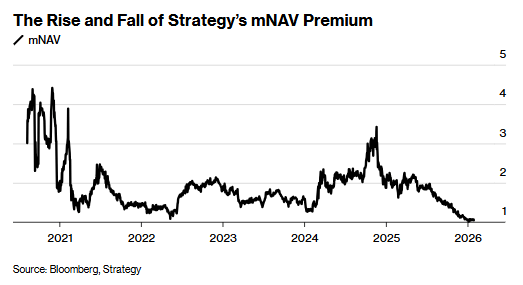Strategy的核心操作逻辑十分简单:以高于其比特币持仓价值的价格发行股票融资,再用所得现金购入更多比特币。这一资本市场操作手法,本质上是通过股市套利实现加密货币资产增持,也让该公司在上一轮加密货币牛市中成为投机投资者的心头好。但这一红利期已然落幕。