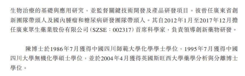 陈俐娟是中国生物技术行业经验丰富的资深人士,具有深厚的科学造诣与卓越的商业智慧。创立集团之前,她于1995年7月至2000年10月于四川大学任职。自2006年7月至2025年12月担任四川大学生物治疗国家重点实验室副主任,专注于生物治疗的基础与应用研究,并监督关键技术开发及产品研发项目;曾任广东省创新团队带头人及国内肿瘤和糖尿病研发团队带头人;其自2012年1月至2017年12月担任广东众生药业股份有限公司首席科学家,负责领导创新药物研发。