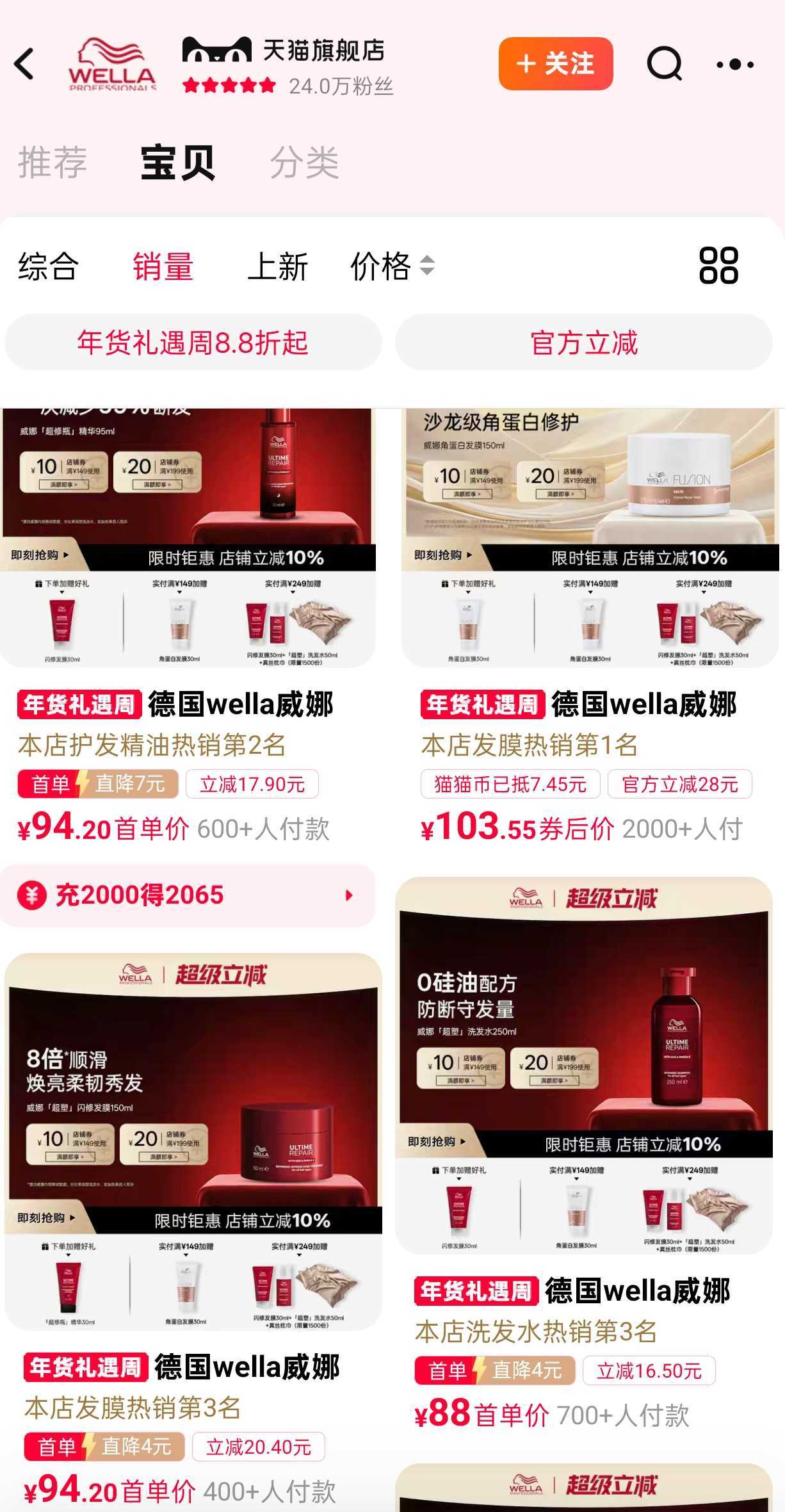 以威娜品牌为例,其以专业线渠道为根基,同时在天猫、京东等电商平台开设旗舰店,形成了线上与线下协同的渠道网络。从威娜天猫旗舰店来看,该店铺上架了近20款产品链接,产品包括发膜、洗发水、护发精油等,价格在50-200元之间,其中有5款产品销量在1000+。截至发稿,该店铺粉丝数达24万。