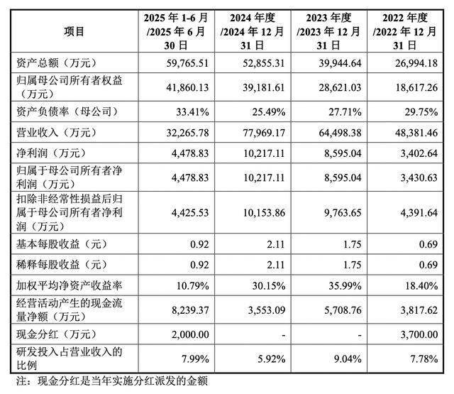 据招股书,2022年-2024年及2025上半年,九安智能实现营收分别为4.84亿元、6.45亿元、7.8亿元、3.23亿元;归母净利润分别为3430.63万元、8595.04万元、1.02亿元、4478.83万元。