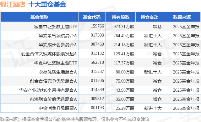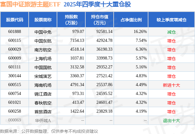 根据2025基金年报公募基金重仓股数据,重仓该股的公募基金共19家,其中持有数量最多的公募基金为富国基金的富国中证旅游主题ETF。富国中证旅游主题ETF目前规模为56.94亿元,最新净值0.8225(2月4日),较上一交易日上涨2.83%,近一年上涨23.31%。该公募基金现任基金经理为曹璐迪 殷钦怡。曹璐迪在任的基金产品包括:富国中证价值ETF联接A,管理时间为2020年5月20日至今,期间收益率为126.33%;富国中证价值ETF,管理时间为2020年5月20日至今,期间收益率为137.59%;富国创业板ETF,管理时间为2020年8月6日至今,期间收益率为17.55%;富国中证科创创业50ETF,管理时间为2021年6月29日至今,期间收益率为-4.55%。殷钦怡在任的基金产品包括:富国中证细分化工产业主题ETF发起式联接A,管理时间为2024年7月23日至今,期间收益率为60.98%;富国中证全指证券公司ETF,管理时间为2024年7月23日至今,期间收益率为46.63%;富国中证细分化工产业主题ETF,管理时间为2024年7月23日至今,期间收益率为66.04%;富国中证全指建筑材料ETF,管理时间为2024年7月23日至今,期间收益率为34.83%。