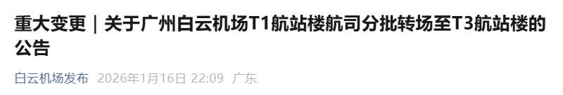 公告表示,2026年春运临近,为进一步优化航站楼资源配置,营造欢乐祥和、顺畅高效的出行环境,更好满足广大旅客出行需求,现将T1航站楼相关航司转场至T3航站楼安排公告如下: