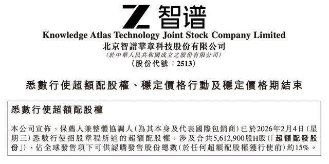 瑞财经 吴文婷 2月4日,智谱发布公告称,保荐人兼整体协调人已于当日悉数行使招股章程所述的超额配股权,涉及合共561.29万股H股,占全球发售项下可供认购发售股份总数约15%。