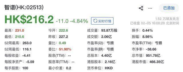 截至2月5日发稿时,智谱报216.2港元,跌4.84%,总市值约951.78亿港元。