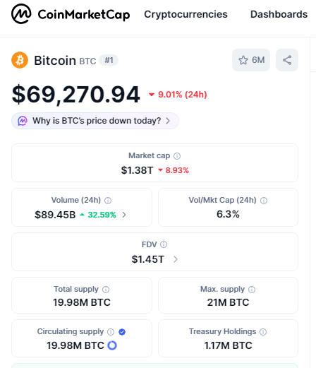 根据报价平台CoinMarketCap的数据,北京时间2月5日20时20分,比特币价格跌破7万美元,报69270.94美元,24小时跌幅达到9.01%。