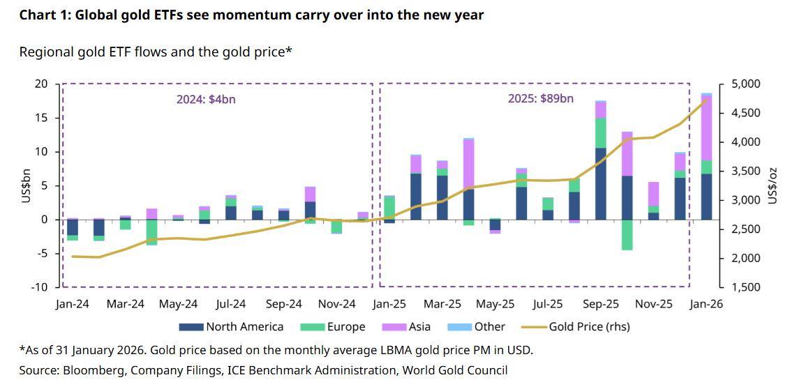 亚洲黄金ETF1月净流入高达100亿美元,远高于2025年月均水平,为连续第五个月净流入,创下该地区历史最高月度纪录。