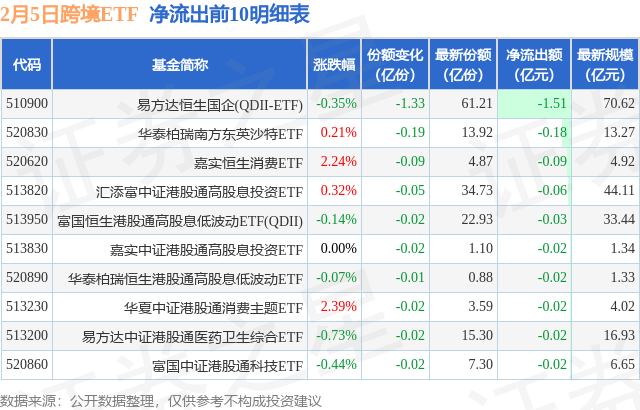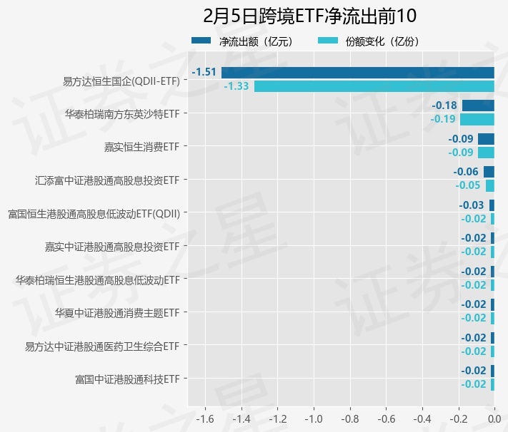 当日有18只跨境ETF基金出现资金净流出,其中净流出排首位的是易方达恒生国企(QDII-ETF)(510900),份额减少了1.33亿份,净流出额为1.51亿元。