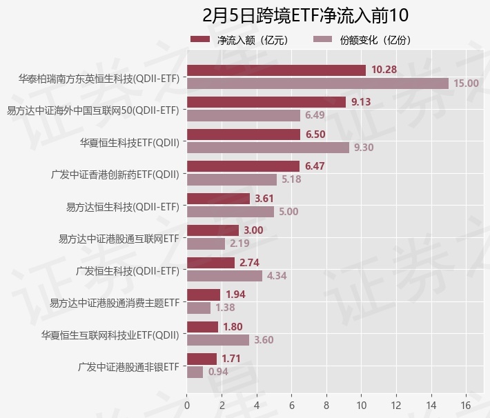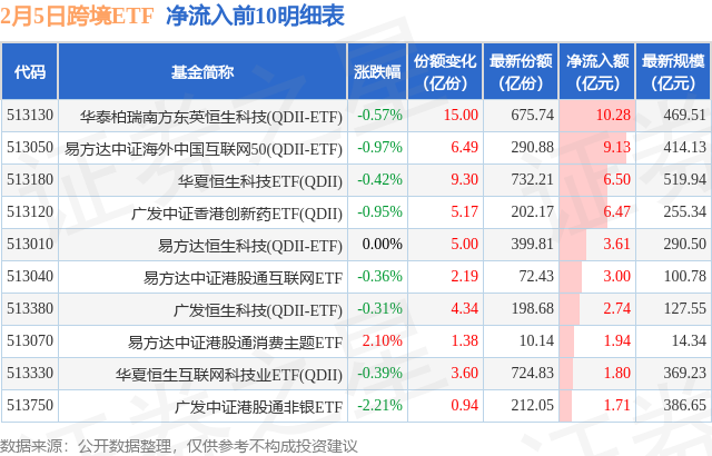 当日有53只跨境ETF基金出现资金净流入,其中净流入排首位的是华泰柏瑞南方东英恒生科技(QDII-ETF)(513130),份额增加了15.0亿份,净流入额为10.28亿元。