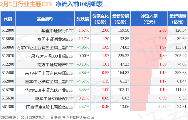 当日有124只行业主题ETF基金出现资金净流入,其中净流入排首位的是华宝中证银行ETF(512800),份额增加了2.66亿份,净流入额为2.09亿元。