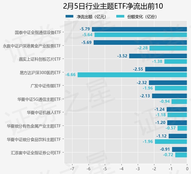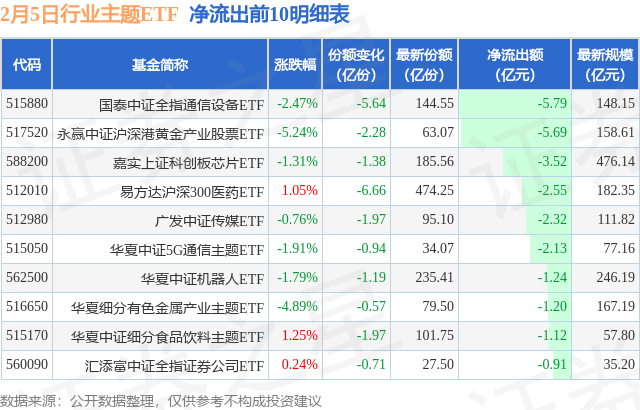 当日有104只行业主题ETF基金出现资金净流出,其中净流出排首位的是国泰中证全指通信设备ETF(515880),份额减少了5.64亿份,净流出额为5.79亿元。