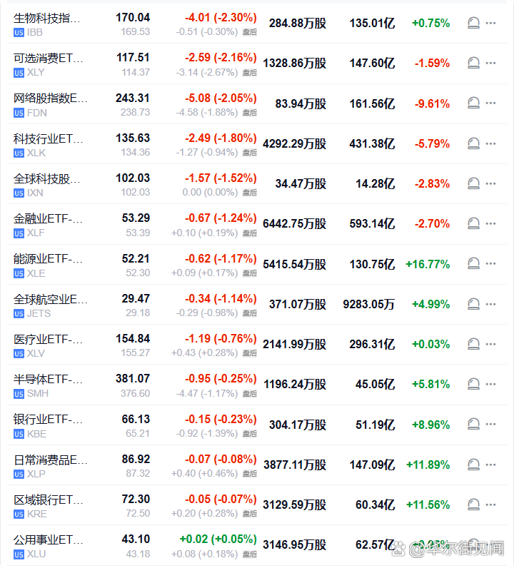 美股大类资产类ETF中,黄金ETF收跌2.66%,罗素2000指数ETF跌1.80%,美国布伦特油价基金、纳指100 ETF、标普500 ETF、道指ETF至多跌1.49%,新兴市场ETF跌0.46%,农产品基金涨0.23%,做多美元指数涨0.30%,美国国债20+年ETF涨1.09%,大豆基金涨1.50%。