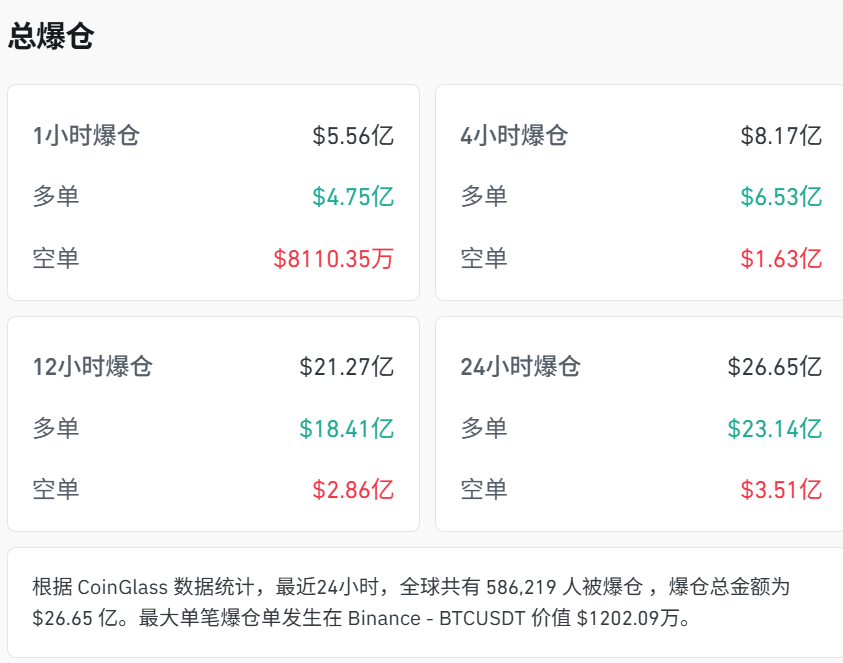 CoinGlass数据显示,最近24小时,全球共有586,219人被爆仓,爆仓总金额为26.65亿美元。其中多单23.14亿美元,空单3.51亿美元。