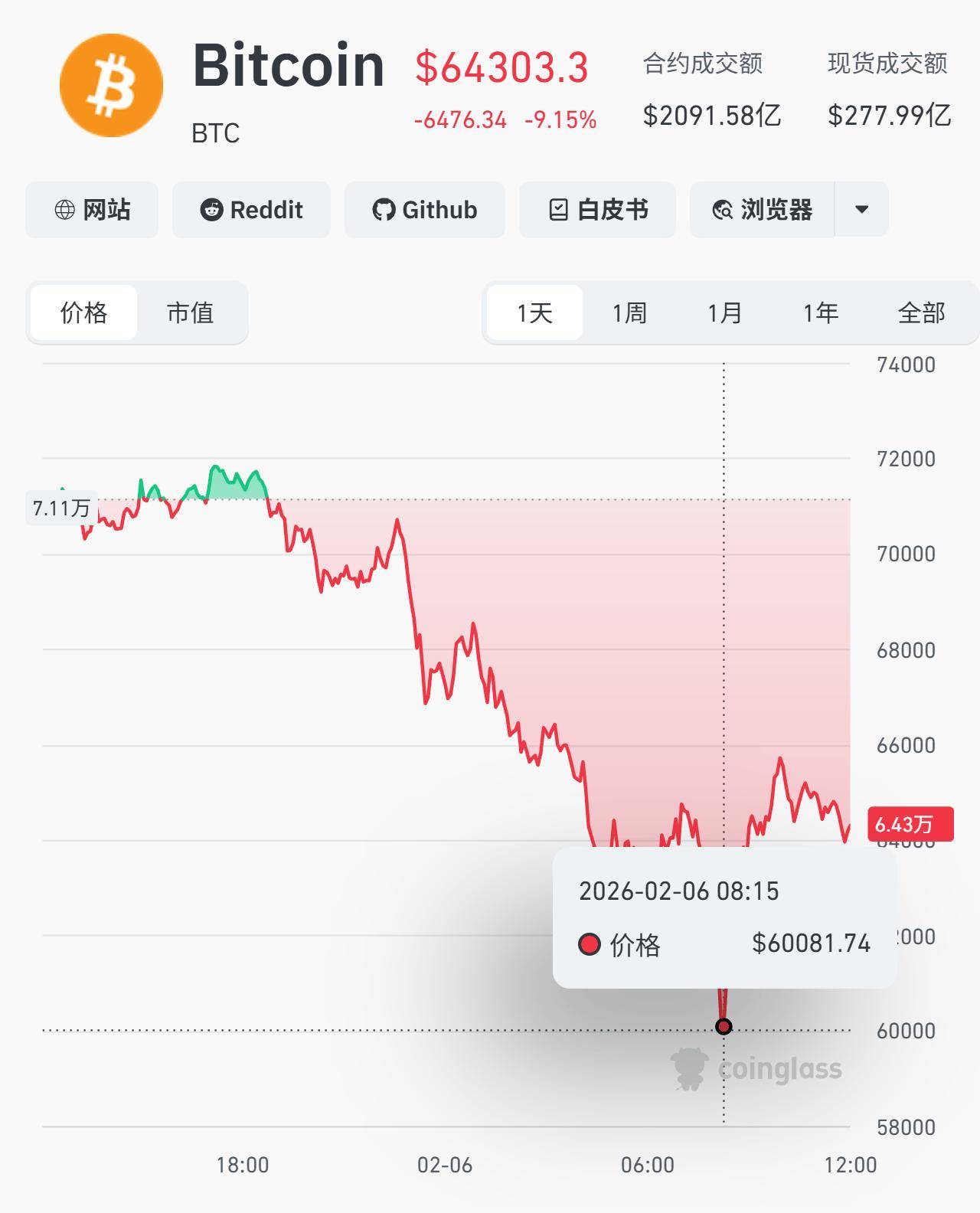 IT之家 2 月 6 日消息,受宏观经济与政策预期双重打击,加密货币市场遭到全面重挫。比特币今天(2 月 6 日)一度跌至 60081.74 美元(IT之家注:现汇率约合 41.7 万元人民币),创 2024 年 10 月以来新低,过去 24 小时跌幅创 2022 年 11 月以来之最。