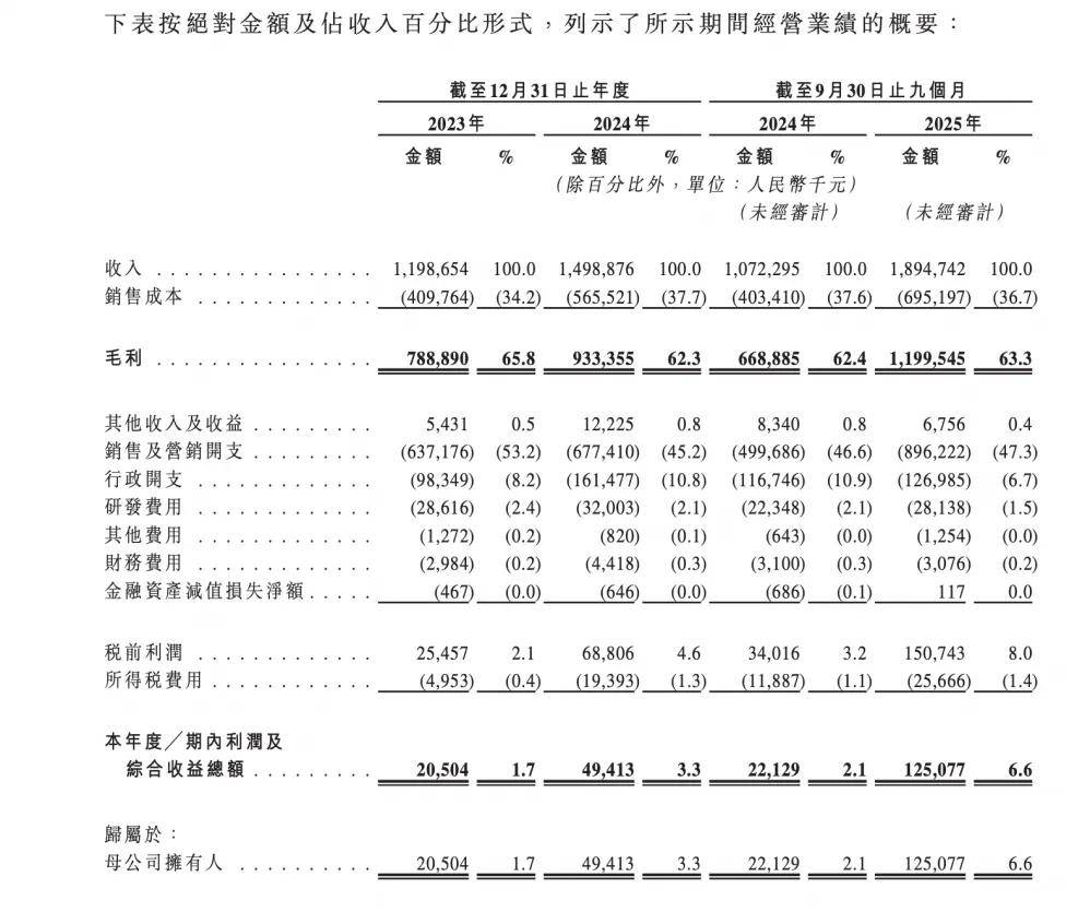 但事实上,这个营销费率水平在美妆行业内较为常见。在美妆行业,营收规模的激增往往伴随着营销成本的飙升,但半亩花田的一个反常之处是,2023年至2025年前三季度,其营收从 11.99亿元跳涨至18.95亿元,而与之相对应的是销售及营销开支占比,却从53.2%降至47.3%。