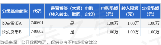 注:1. 自2026年2月12日起,投资者申购(含转换转入及定期定额投资,下同)长安货币市场证券投资基金(以下简称“长安货币”)时,单日每个基金账户的申购、转换转入及定期定额投资累计金额应不超过1万元(长安货币A、B两类基金份额申请金额予以合计),如单日每个基金账户的申购、转换转入及定期定额投资累计金额超过上述限额的,本基金管理人将本着保护基金份额持有人合法权益的原则根据基金资产运作情况进行评估,并有权拒绝。敬请投资者及早做好交易安排,避免因暂停大额申购、转换转入及定期定额投资业务带来的不便及资金的损失。