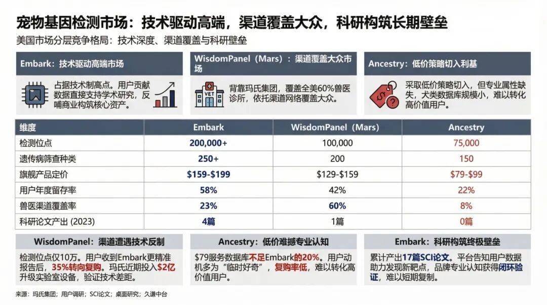 WisdomPanel背靠玛氏集团,覆盖了全美60%的兽医诊所,渠道优势巨大。技术短板是其硬伤,导致其不得不投入2亿美元升级实验室设备,试图缩小与Embark的代差。