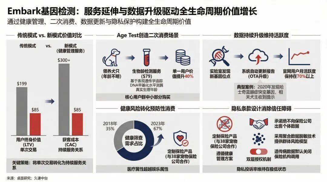 此外,Embark还把基因报告做成了SaaS服务,当实验室发现新的基因位点时,系统会自动更新旧报告。这种类似手机系统升级的体验,让官网的月活跃度始终保持在70%以上。