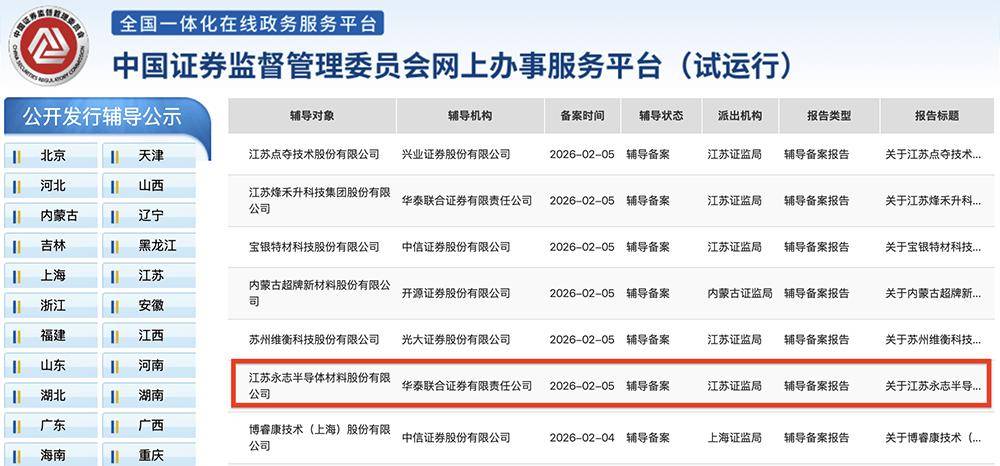芯东西2月6日报道,2月5日,证监会官网披露,江苏泰州半导体封装材料企业永志股份在江苏证监局办理上市辅导备案登记,启动A股IPO进程,向北交所上市发起冲刺,辅导机构是华泰联合证券。