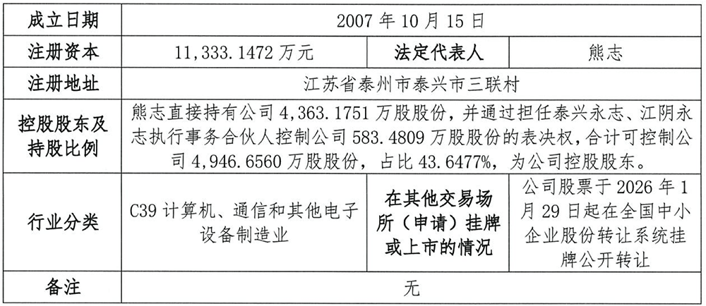 永志股份的前身是泰兴市永志电子器件厂,是由大生镇集体资产管理委员会在2002年4月出资设立的集体企业。2024年,永志股份获评国家级专精特新“小巨人”企业。