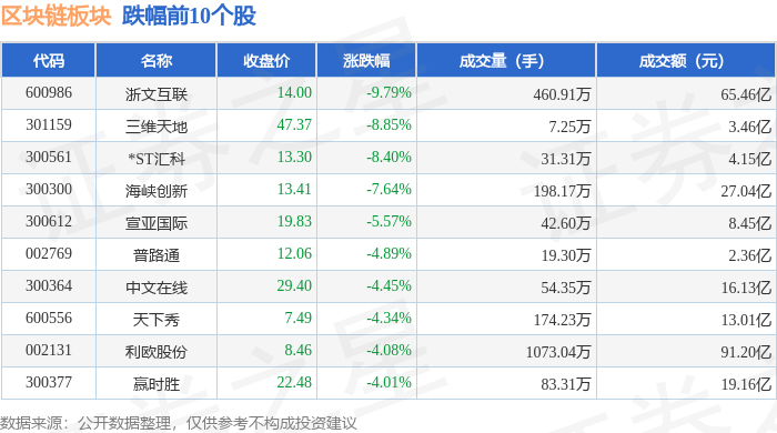 证券之星消息,2月6日区块链板块较上一交易日下跌1.01%,浙文互联领跌。当日上证指数报收于4065.58,下跌0.25%。深证成指报收于13906.73,下跌0.33%。区块链板块个股涨跌见下表: