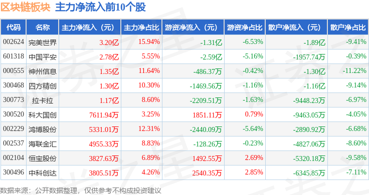 从资金流向上来看,当日区块链板块主力资金净流出61.6亿元,游资资金净流入2.92亿元,散户资金净流入58.68亿元。区块链板块个股资金流向见下表: