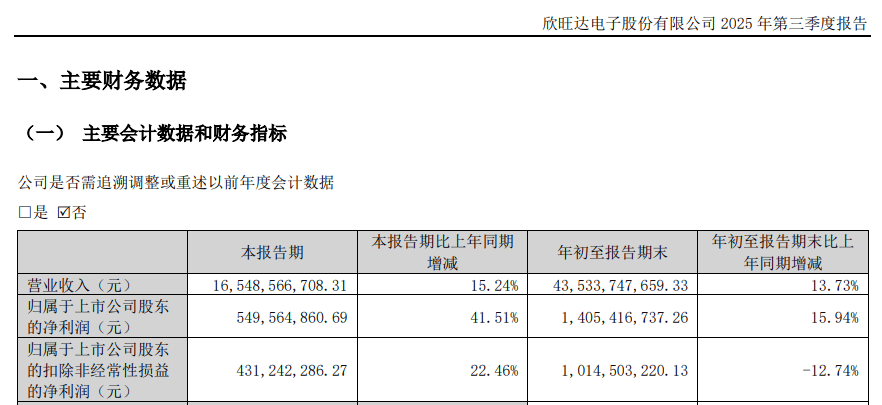 2025年前三季度,欣旺达的归母净利润为14.05亿元,同比增长15.94%。
