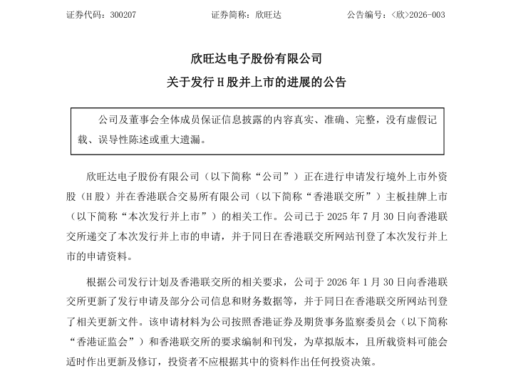 目前,欣旺达正在申报港股IPO。2026年1月30日,欣旺达公告称,公司已于2025年7月30日向港交所递交了本次发行并上市的申请,2026年1月30日向港交所更新了发行申请及部分公司信息和财务数据等。