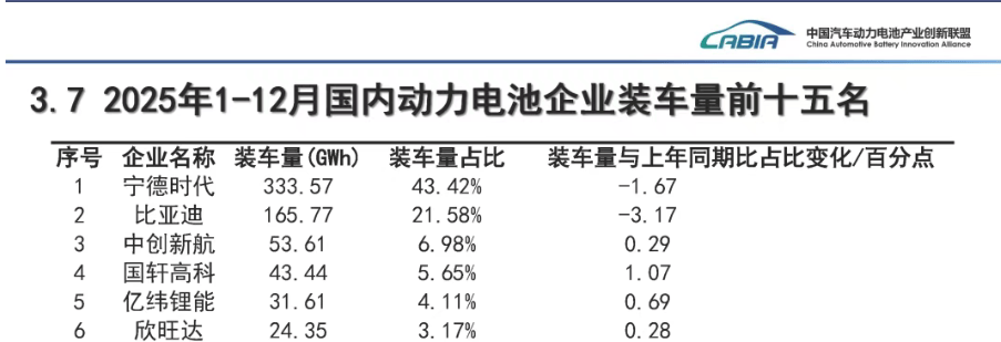 中国汽车动力电池产业创新联盟数据显示,2025年全年,欣旺达的动力电池装车量位列国内动力电池企业第六名,装车量占比达3.17%。