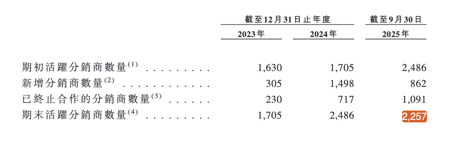 更值得注意的是,分销商数量大进大出。2024年新增了1498家分销商,同时终止了717家。而2025年前三季度,公司新增分销商数量862家,终止合作1091家,截至2025年9月底,公司仅剩下2257家分销商。