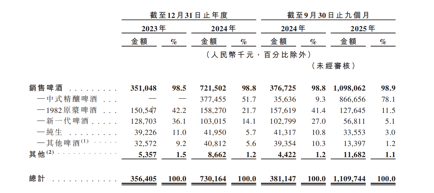 2024年开始,公司进入业绩爆发期。2023-2024年及2025年前三季度,公司分别收入3.6亿元、7.3亿元及11.1亿元,净利润分别1220万元、1.3亿元、3.1亿元,2024年营收同比翻一倍,净利润增长逾9倍;2025年前三季度收入继续增长近两倍,利润增长超过11倍。截至2025年三季度末,中式精酿啤酒贡献近八成营收,而上年同期仅不到10%。