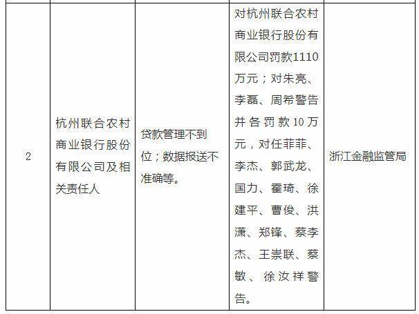 公告显示,因贷款管理不到位、数据报送不准确等,对杭州联合农村商业银行股份有限公司罚款1110万元;对朱亮、李磊、周希警告并各罚款10万元,对任菲菲、李杰、郭武龙、国力、霍琦、徐建平、曹俊、洪潇、郑锋、蔡李杰、王崇联、蔡敏、徐汝祥警告。