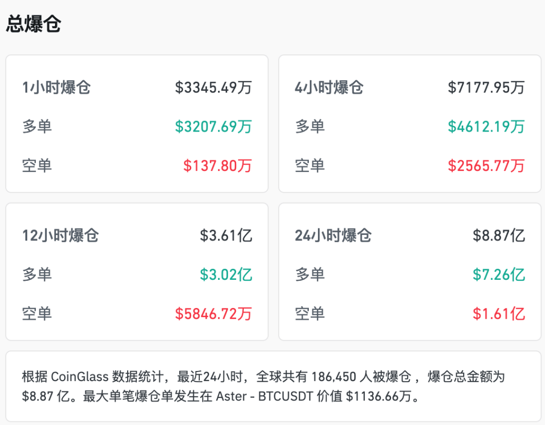 根据CoinGlass数据统计,最近24小时,全球共有18.64万人爆仓,爆仓总金额为8.87亿美元。最大单笔爆仓单发生在Aster - BTCUSDT 价值为1136.66万美元。