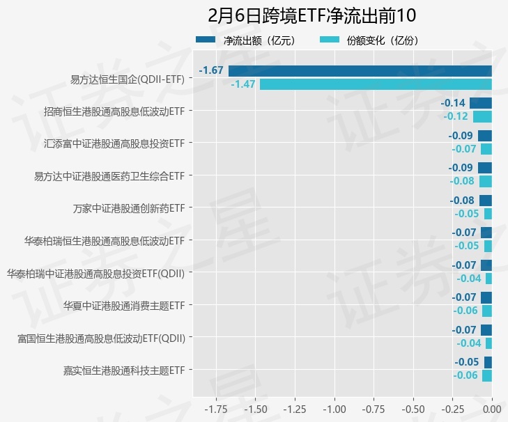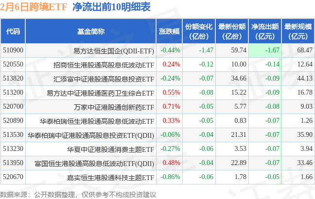 当日有22只跨境ETF基金出现资金净流出,其中净流出排首位的是易方达恒生国企(QDII-ETF)(510900),份额减少了1.47亿份,净流出额为1.67亿元。