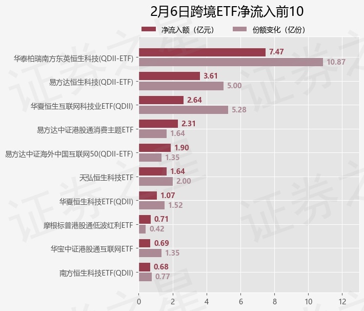当日有39只跨境ETF基金出现资金净流入,其中净流入排首位的是华泰柏瑞南方东英恒生科技(QDII-ETF)(513130),份额增加了10.87亿份,净流入额为7.47亿元。