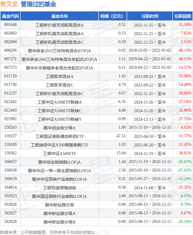 重仓股战绩回顾:其管理的工银新机遇灵活配置混合A在2025年第二季度调入新易盛,调入当季均价950.7,连续持有1个季度后,在2025年第三季度调出,调出当季均价2887.1,估算收益率为203.68%(估算收益率按后复权的调入调出季度均价算出)。